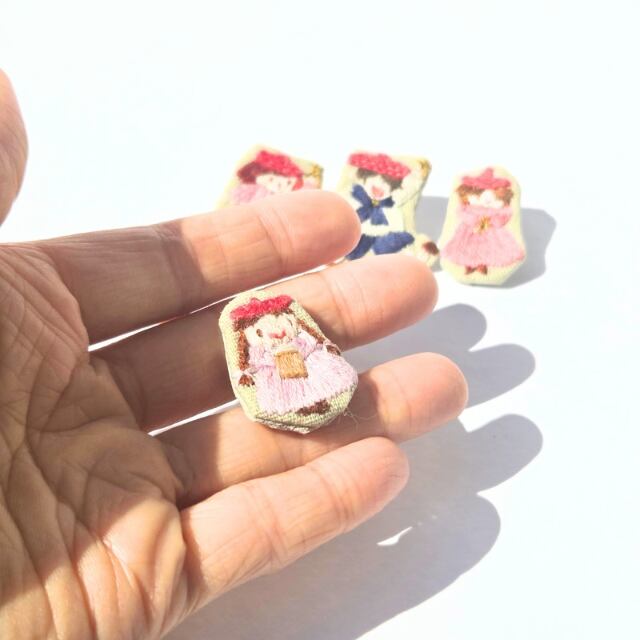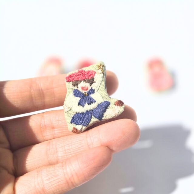 今回のピンバッチは小人の子供たちを刺繍しました。