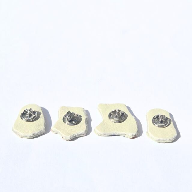 裏側は本革を使用しシルバーのピンバッジの金具を取り付け強力接着剤でしっかり止めております。しっかりとしたピンバッチになっており、つけはずしが非常にしやすくなっております。